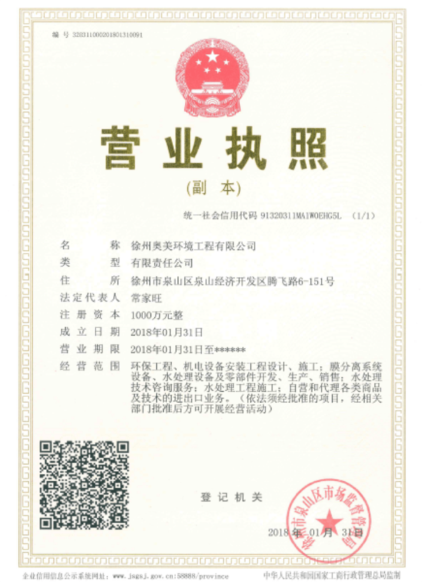 為更好的開拓公司業(yè)務(wù),優(yōu)化公司的戰(zhàn)略布局,增強公司盈利能力,進一步提高公司綜合競爭力,公司與徐州泉山經(jīng)濟開發(fā)區(qū)投資發(fā)展有限公司聯(lián)合成立徐州奧美環(huán)境工程有限公司。近日,該控股子公司已完成工商注冊登記手續(xù),并取得徐州市泉山區(qū)市場監(jiān)管局核發(fā)的《營業(yè)執(zhí)照》,2018奧美環(huán)境進入開枝散葉階段!