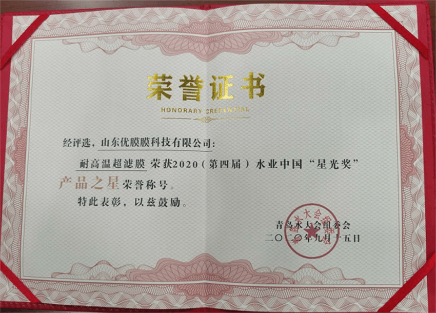 本次大會設(shè)立了2020(第四屆)水業(yè)中國“星光獎(jiǎng)”“產(chǎn)品之星”的評選活動(dòng),參與評選的產(chǎn)品都是來自全國各地的具有雄厚實(shí)力企業(yè)的拳頭產(chǎn)品,經(jīng)歷層層評選,山東優(yōu)膜膜科技有限公司耐高溫超濾膜憑借優(yōu)越的化學(xué)穩(wěn)定性和超高的耐溫性能一舉獲得了2020年第四屆水業(yè)中國“星光獎(jiǎng)”“產(chǎn)品之星”的榮譽(yù)稱號,在此,特別感謝組委會對優(yōu)膜科技耐高溫超濾膜給予的高度肯定。