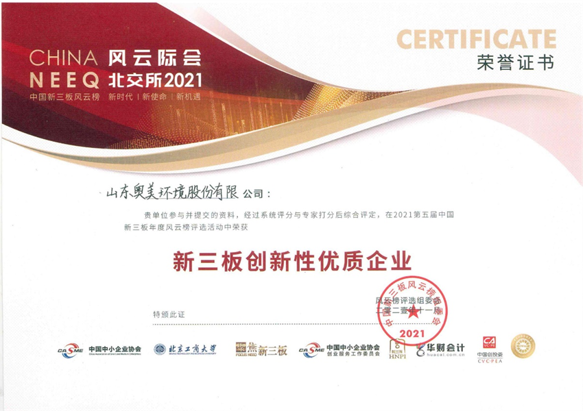 公司在2021年第五屆中國新三板年度風(fēng)云榜評選活動中,經(jīng)過系統(tǒng)評分和組委會專家打分后綜合評定后,榮獲新三板創(chuàng)新性優(yōu)質(zhì)企業(yè)。